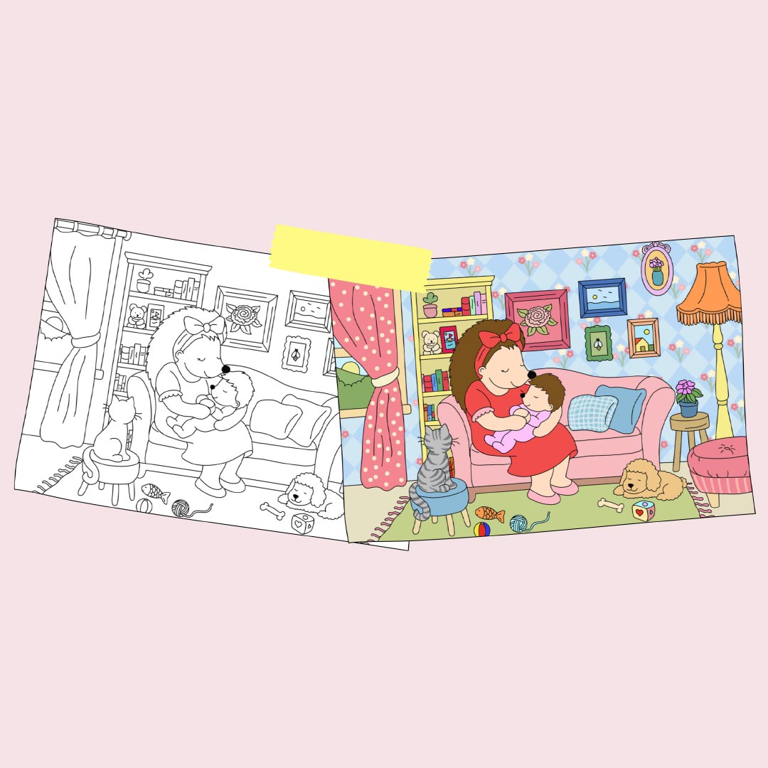 In questo disegno la mamma sussurra una dolce ninna nanna al suo cucciolo e lo tiene stretto stretto al suo cuore. Tra le braccia della mamma, il mondo si fa piccolo e silenzioso.