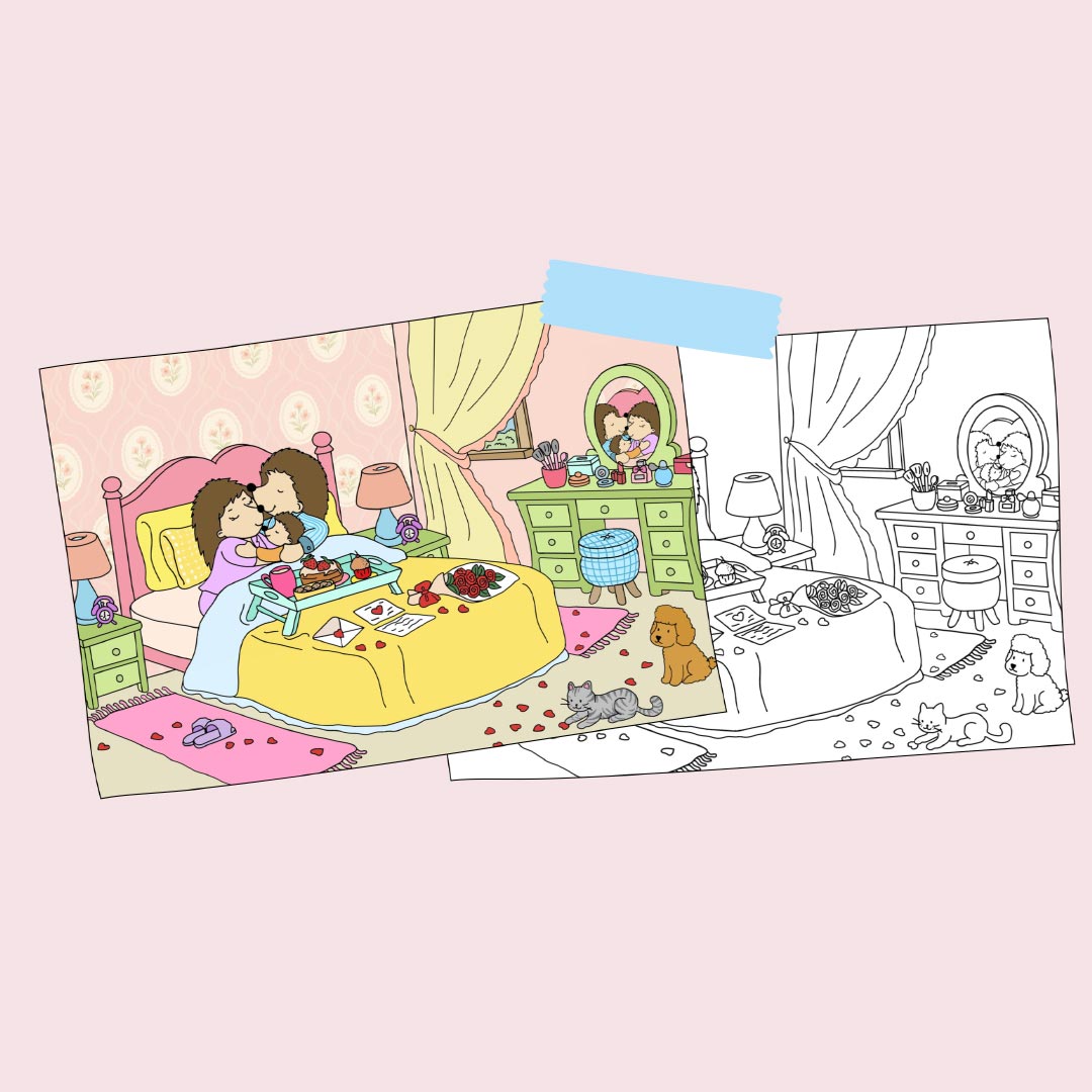 Questo disegno mostra una scena tenerissima e intima, dove una famiglia di ricci si abbraccia con affetto sul letto, e fanno un regalo alla mamma: un bellissimo mazzo di fiori e una dolce lettera, creando un momento di puro amore e calore domestico.
